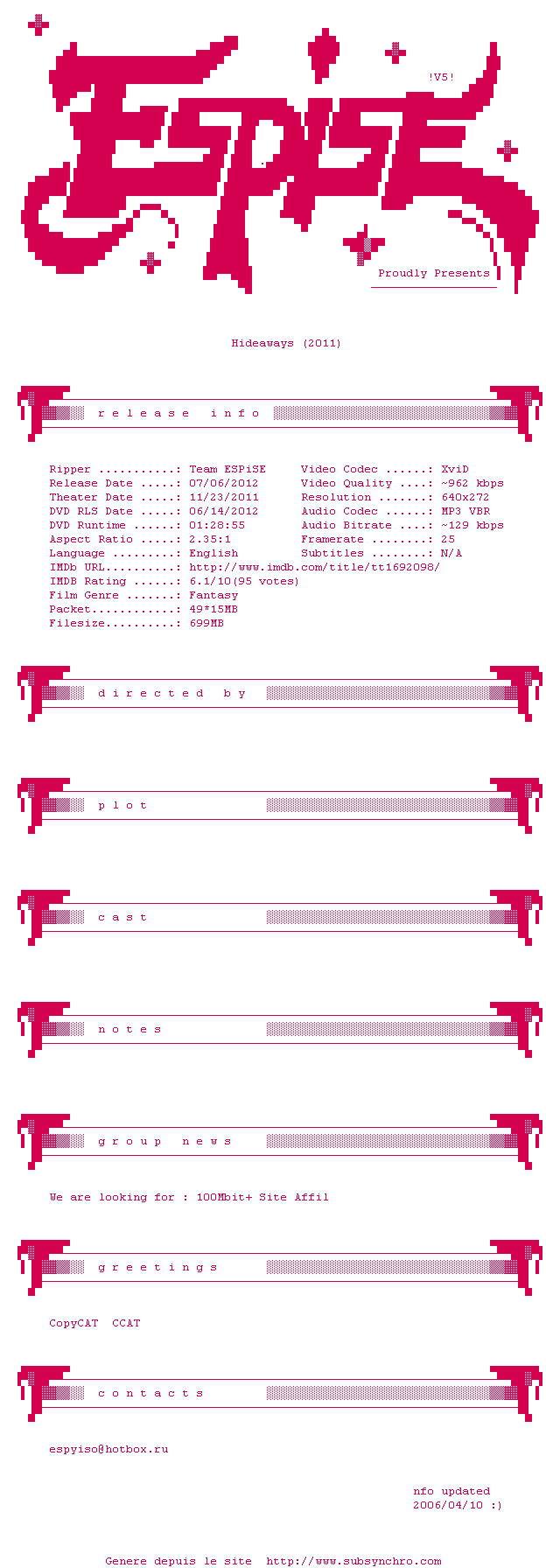 Voir le nfo de la release Hideaways.2011.DVDRip.XviD-ESPiSE