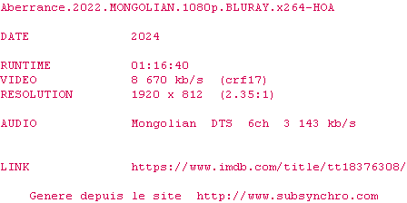 Voir le nfo de la release Aberrance.2022.MONGOLIAN.1080p.BLURAY.x264-HOA