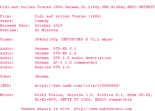 Voir le nfo de la release Didi.Auf.Vollen.Touren.1986.German.DL.2160p.UHD.BluRay.HEVC-UNTHEVC