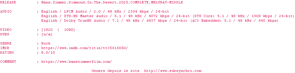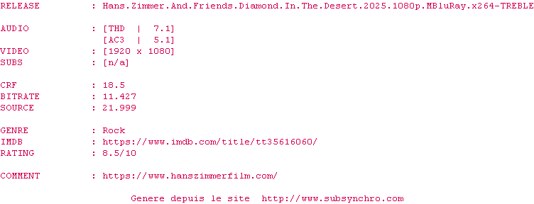 Voir le nfo de la release Hans.Zimmer.And.Friends.Diamond.In.The.Desert.2025.1080p.MBluRay.x264-TREBLE