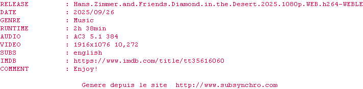 Voir le nfo de la release Hans.Zimmer.And.Friends.Diamond.In.The.Desert.2025.1080p.WEB.H264-WEBLE