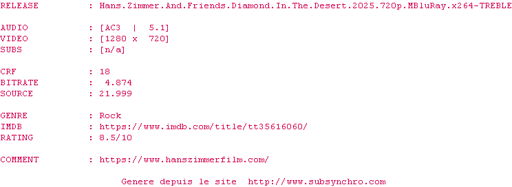 Voir le nfo de la release Hans.Zimmer.And.Friends.Diamond.In.The.Desert.2025.720p.MBluRay.x264-TREBLE