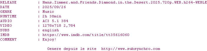 Voir le nfo de la release Hans.Zimmer.And.Friends.Diamond.In.The.Desert.2025.720p.WEB.H264-WEBLE