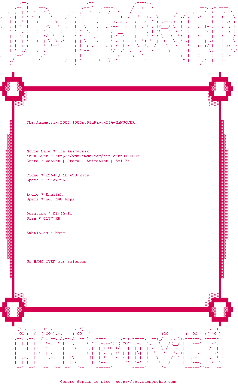 Voir le nfo de la release The.Animatrix.2003.1080p.BluRay.x264-HANGOVER