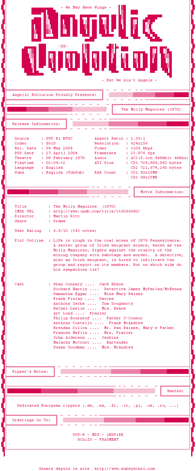 Voir le nfo de la release The.Molly.Maguires.1970.1080p.BluRay.x265.10bit-r00t