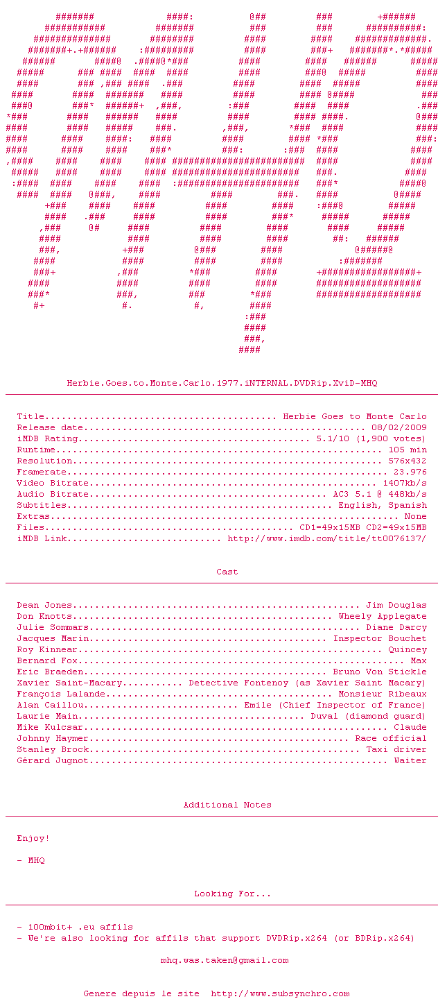 Voir le nfo de la release Herbie.Goes.To.Monte.Carlo.1977.iNTERNAL.DVDRip.XviD-MHQ