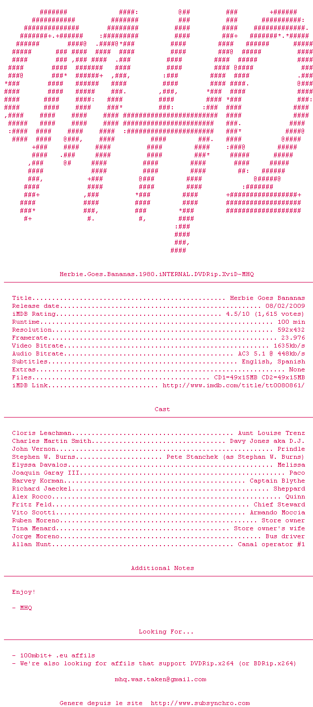 Voir le nfo de la release Herbie.Goes.Bananas.1980.iNTERNAL.DVDRip.XviD-MHQ