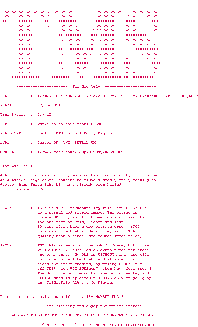 Voir le nfo de la release I.Am.Number.Four.2011.DTS.And.DD5.1.Custom.DK.SWESubs.DVDR-TilMigSelv