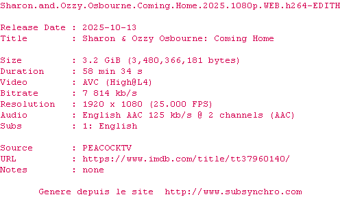 Voir le nfo de la release Sharon.And.Ozzy.Osbourne.Coming.Home.2025.1080p.WEB.H264-EDITH