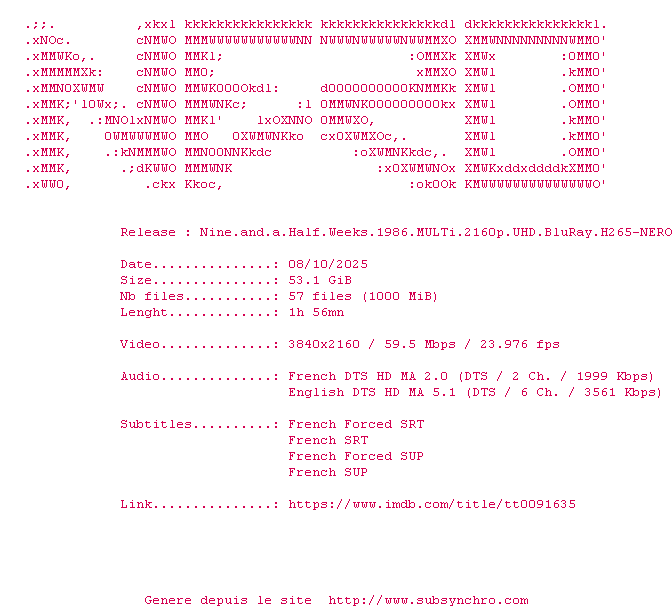 Voir le nfo de la release Nine.And.A.Half.Weeks.1986.MULTi.2160p.UHD.BluRay.H265-NERO