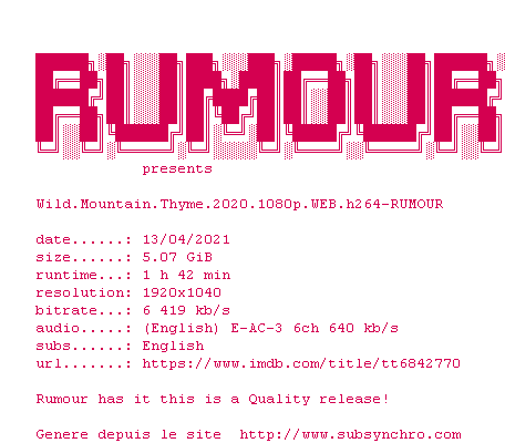 Voir le nfo de la release Wild.Mountain.Thyme.2020.720p.WEB.H264-RUMOUR