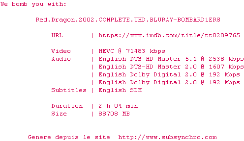 Voir le nfo de la release Red.Dragon.2002.2160p.UHD.BluRay.x265-B0MBARDiERS