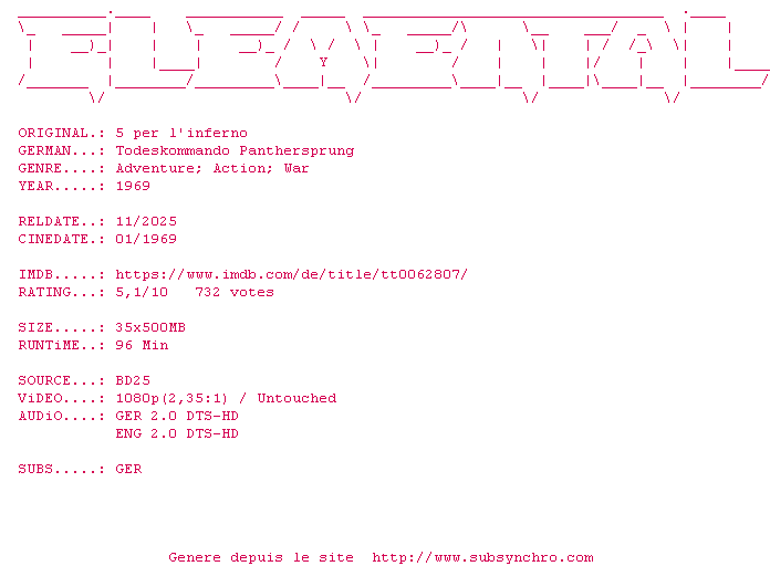 Voir le nfo de la release Todeskommando.Panthersprung.1969.Remastered.German.DL.1080p.BluRay.AVC-ELEMENTAL