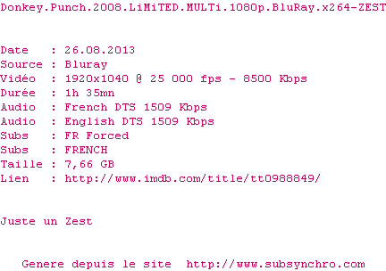 Voir le nfo de la release Donkey.Punch.2008.LiMiTED.MULTi.1080p.BluRay.x264-ZEST