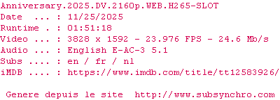 Voir le nfo de la release Anniversary.2025.HDR.2160p.WEB.H265-SLOT