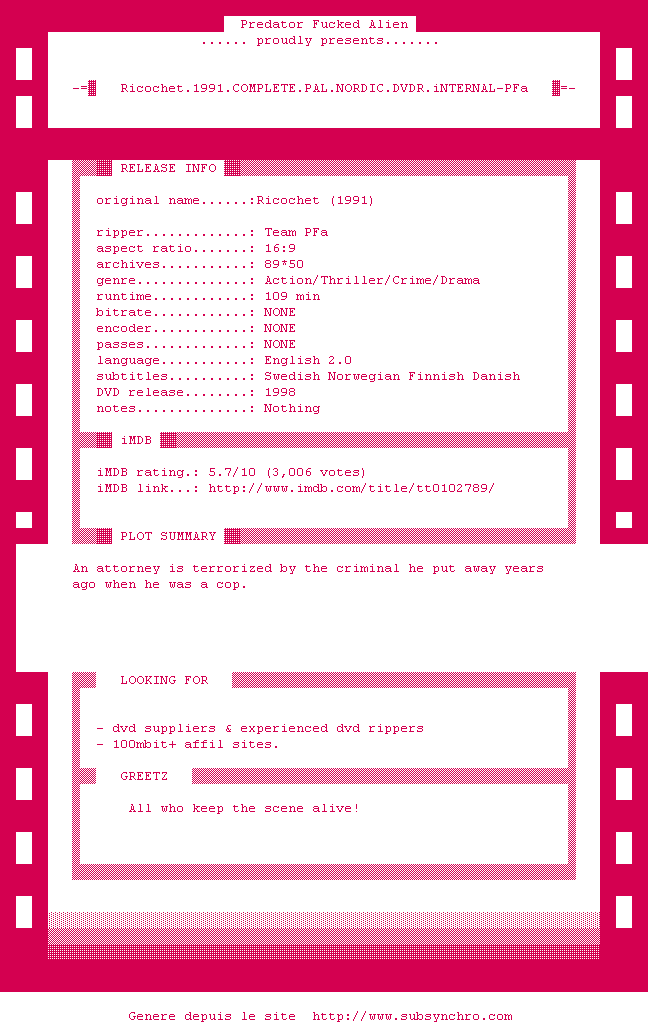 Voir le nfo de la release Ricochet.1991.COMPLETE.PAL.NORDIC.DVDR.iNTERNAL-PFa