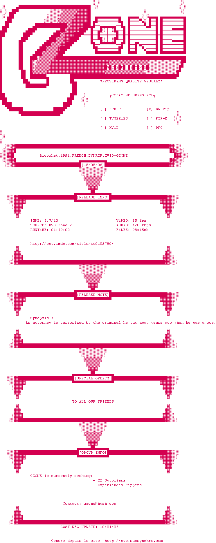 Voir le nfo de la release Ricochet.1991.FRENCH.DVDRIP.XVID-GZONE