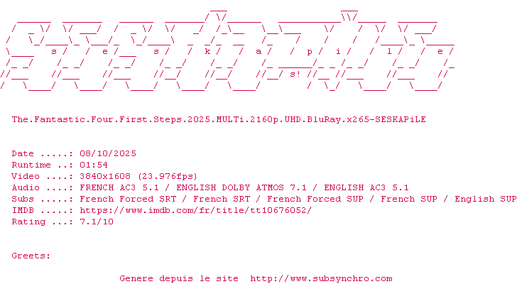 Voir le nfo de la release The.Fantastic.Four.First.Steps.2025.MULTi.2160p.UHD.BluRay.x265-SESKAPiLE