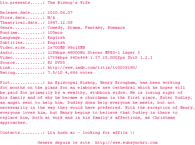 Voir le nfo de la release The.Bishops.Wife.1947.DVDRip.XviD-Ltu