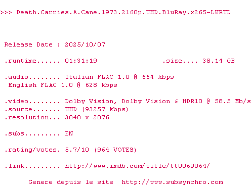 Voir le nfo de la release Death.Carries.A.Cane.1973.2160p.UHD.BluRay.x265-LWRTD