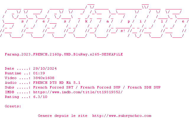Voir le nfo de la release Farang.2023.FRENCH.2160p.UHD.BluRay.x265-SESKAPiLE