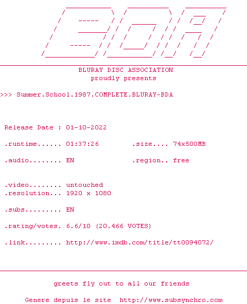 Voir le nfo de la release Summer.School.1987.COMPLETE.BLURAY-BDA