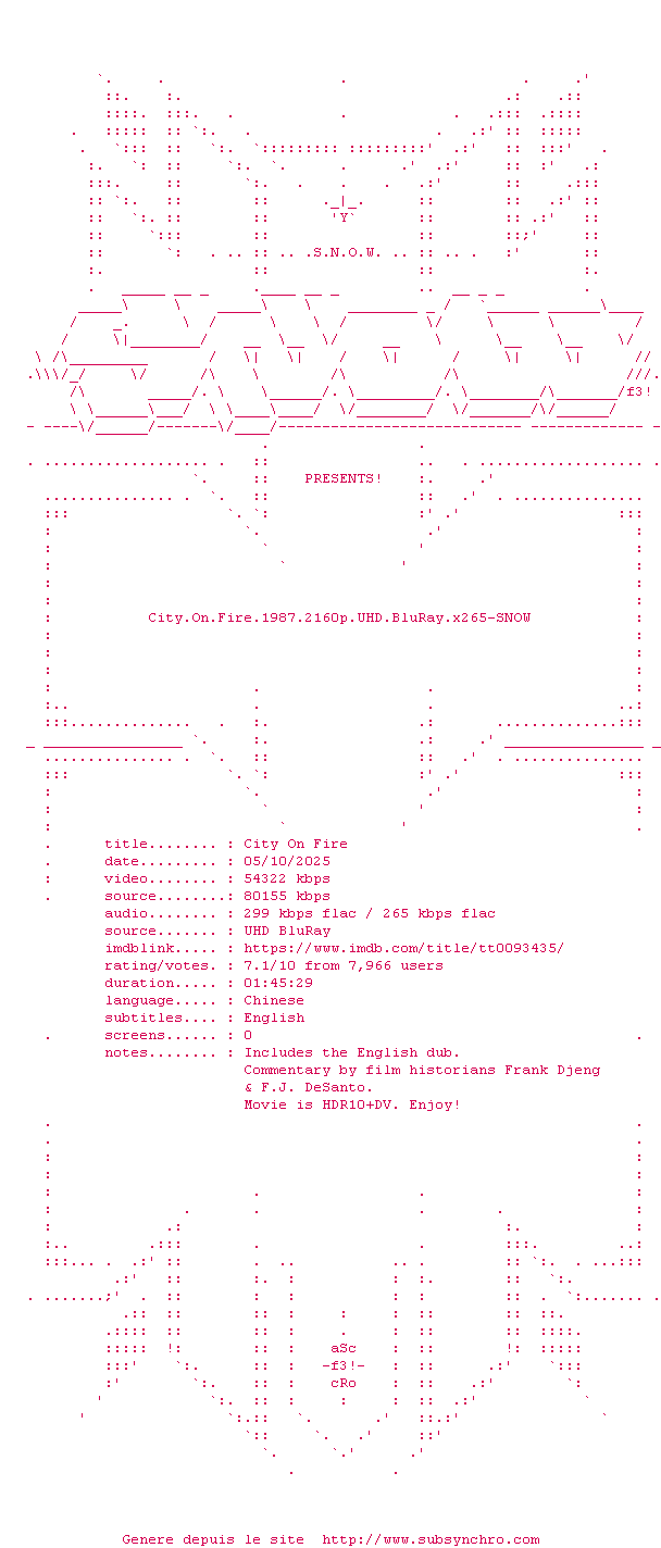 Voir le nfo de la release City.On.Fire.1987.2160p.UHD.BluRay.x265-SNOW