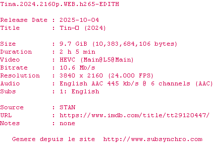 Voir le nfo de la release Tina.2024.2160p.WEB.H265-EDITH