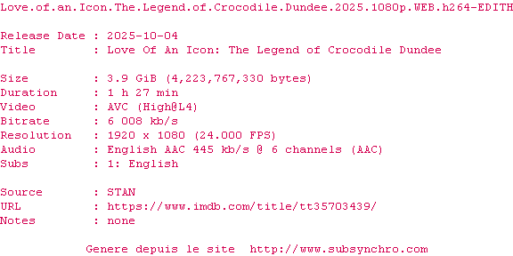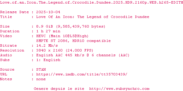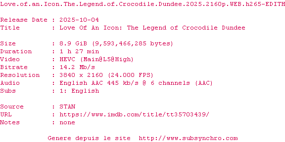 Voir le nfo de la release Love.Of.An.Icon.The.Legend.Of.Crocodile.Dundee.2025.2160p.WEB.H265-EDITH