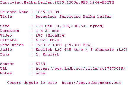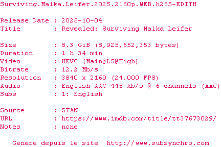 Voir le nfo de la release Surviving.Malka.Leifer.2025.2160p.WEB.H265-EDITH