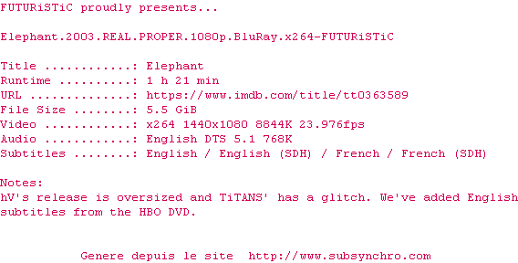 Voir le nfo de la release The.Prophecy.V.Forsaken.2005.1080p.PROPER.BluRay.x264-MOOVEE