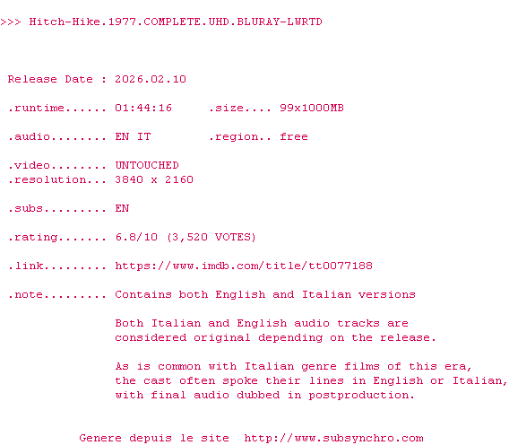 Voir le nfo de la release Hitch-Hike.1977.COMPLETE.UHD.BLURAY-LWRTD