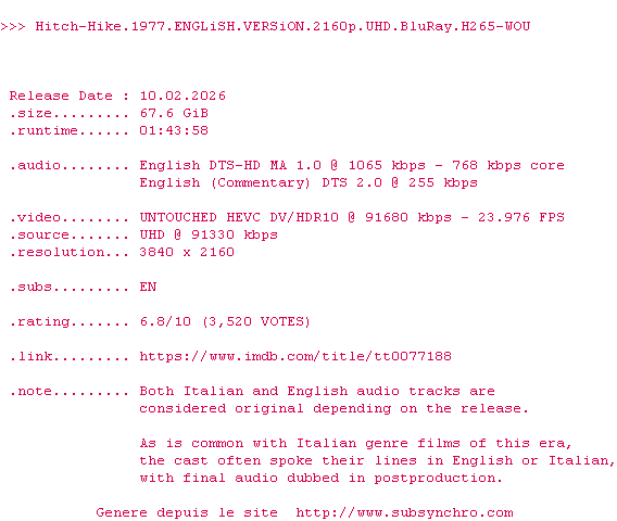 Voir le nfo de la release Hitch-Hike.1977.ENGLiSH.VERSiON.2160p.UHD.BluRay.x265-LWRTD