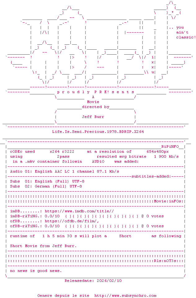 Voir le nfo de la release Life.Is.Semi.Precious.1978.BDRIP.x264-WATCHABLE